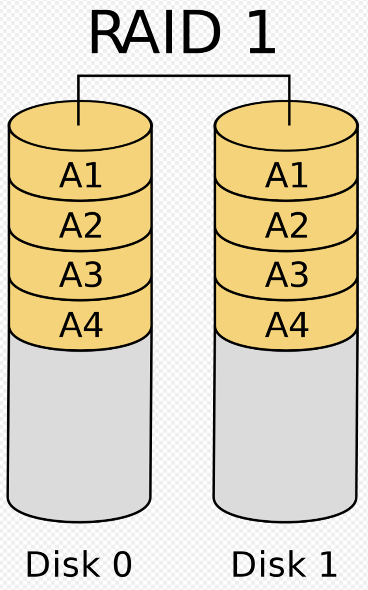 RAID 1 은 디스크 보호를 위해서 나온 기술입니다. 데이터가 동시에 디스크에 저장이 되는 것이지요. 따라서 둘 중 하나의 디스크가 고장 나도 데이터를 이용할 수 있습니다. 또한 디스크 둘 중 하나가 고장 나면 새 걸로 갈아주고 Rebuild를 수행하여 감쪽같이 원상태로 복구하여 2중화를 할 수 있습니다.