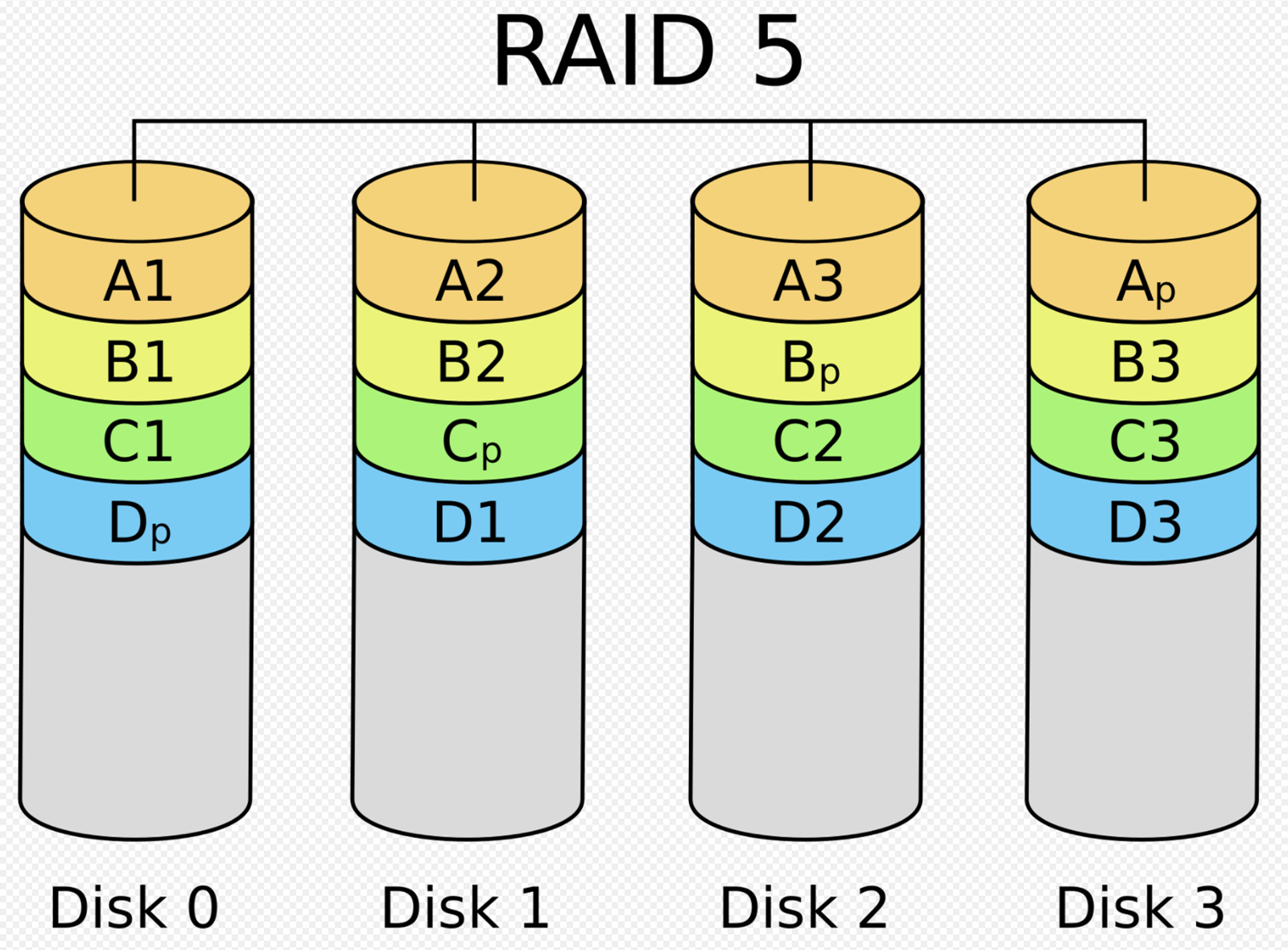내용을 설명드리면 일단 아래 그림을 보면 디스크 4개가 있습니다. 이 디스크를 하나의 디스크처럼 묶어서 쓰는 것이지요. 다만 RAID 0과 1에는 없던 새로운 개념인 Parity(패리티)라는 것이 도입되었습니다. 예를 들어 A 라는 데이터를 Disk 0, Disk 1, Disk 2에 나누어 저장하고 Disk 4에는 A 데이터의 Parity(패리티)가 들어갑니다. 이 Parity(패리티)는 A1~3 중에 특정 데이터가 없어지면 Parity(패리티)를 통해서 복구를 할 수 있는 것이지요. 디지털 신호(비트)는 0 아니면 1이기 때문에 이를 통해서 A의 일부 데이터가 없어지면 오류를 감지해서 복구를 할 수 있습니다. (더 복잡한 내용이 있지만 그것까지 RAID에 그것까지 알 필요는 없습니다. ^^) 이러한 데이터들을 Disk 0~4에 섞어서 넣는 것이지요. 그럼 어떤 디스크가 고장 나더라도 성능에 영향을 덜 미치면서 교체 및 rebuild 가 가능하게 되었습니다.